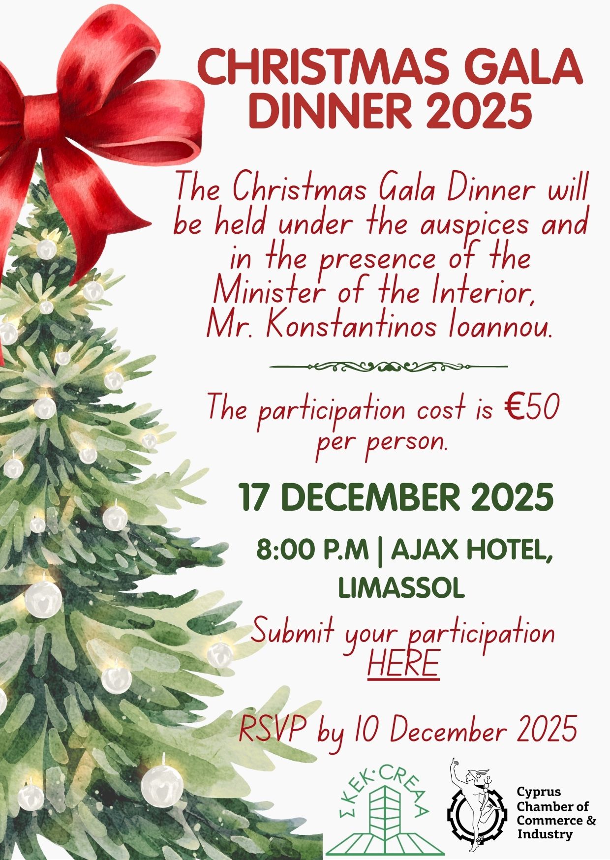 ΣΚΕΚ – Χριστουγεννιάτικο Γκαλά Δείπνο 2025/ CREAA – Christmas Gala Dinner 2025 Please enable JavaScript in your browser to complete this form.Please enable JavaScript in your browser to complete this form.Ονοματεπώνυμο/ Surname *Εταιρεία/CompanyΠόλη/City *Email * Τηλέφωνο/Telephone Number *Πόσες θέσεις στο Γκαλά Δείπνο θα χρειαστείτε; / How many seats will you need for the Gala Dinner? *--- Select Choice ---1234567891011121314151617181920212223242526272829303132333435363738394041424344454647484950Τρόπος Πληρωμής /Payment Method *Έμβασμα/RemittanceΚόστος συμμετοχής: 50 ευρώ ανά άτομο. Τράπεζα: Ελληνική Τράπεζα Όνομα Λογαριασμού: SYND. KTIMATOM. EPIX. KYPROU Αριθμός Λογαριασμού: 241–01–904005–01 IBAN: CY11 0050 0241 0002 4101 9040 0501 / Participation Cost: €50 per person. Bank: Hellenic Bank Account Name: SYND. KTIMATOM. EPIX. KYPROU Account Number: 241–01–904005–01 IBAN: CY11 0050 0241 0002 4101 9040 0501ConsentI give my consent to the Cyprus Real Estate Agents Association and the Cyprus Chamber of Commerce and Industry (CCCI) to send me questionnaires and/or other information related to my participation in the above-mentioned event and/or similar future events.GDPR Agreement *Yes, I agree to participate and accept the processing of my personal data as described belowUnless you authorize the Cyprus Real Estate Agents Association and the CCCI to keep your data for future communication, all information provided will be securely deleted upon the conclusion of the event. Photographs and/or videos may be taken during the event by the CCCI or media representatives for documentation and promotional purposes (e.g., social media, website). The event may also be covered or broadcast by Cypriot and foreign media channels, over which the CCCI has no control. You can withdraw your consent at any time by emailing dpo@ccci.org.cy. In addition to your right to withdraw consent, you also have the right to access, modify, delete, restrict, or object to the processing of your data, which you may exercise by sending a written request to dpo@ccci.org.cy. You also have the right to file a complaint with the Office of the Commissioner for Personal Data Protection. For details, see our Privacy Policy at https://ccci.org.cy/privacy-policy/. https://ccci.org.cy/privacy-policy/#Event_Privacy_Notice Submit
